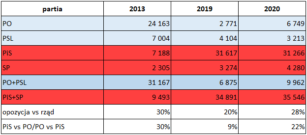 Tak czy inaczej, porównując tylko PiS i PO, ci pierwsi dostali 30 proc. tego, czym zadysponowali drudzy.