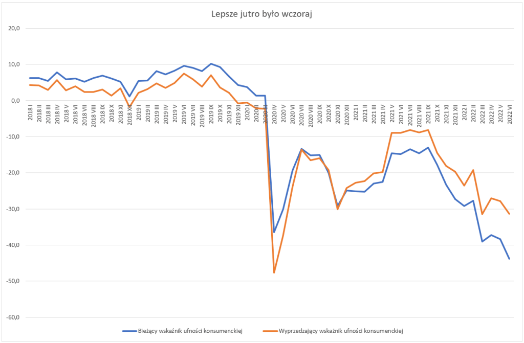 Otóż dzięki światłym rządom Partii i sytuacji na świecie (no bo przecież nie będziemy clickbaitować i pisać o rzeczach lokalnych w oderwaniu od szerokiego kontekstu) mamy rekord. Wynik ujemny nie jest niczym nowym, bo przewaga negatywnych nastrojów towarzyszyła choćby wspomnianym zdarzeniom. Ale nawet w szczycie pandemii nie osiągnęliśmy wartości -43,8. Przewaga osób oceniających teraźniejszość z pesymizmem i obawą jest, można by rzec, znacząca. Jeszcze nie miażdżąca, ale indeks na poziomie prawie -44 robi zajebiście przygnębiające wrażenie.